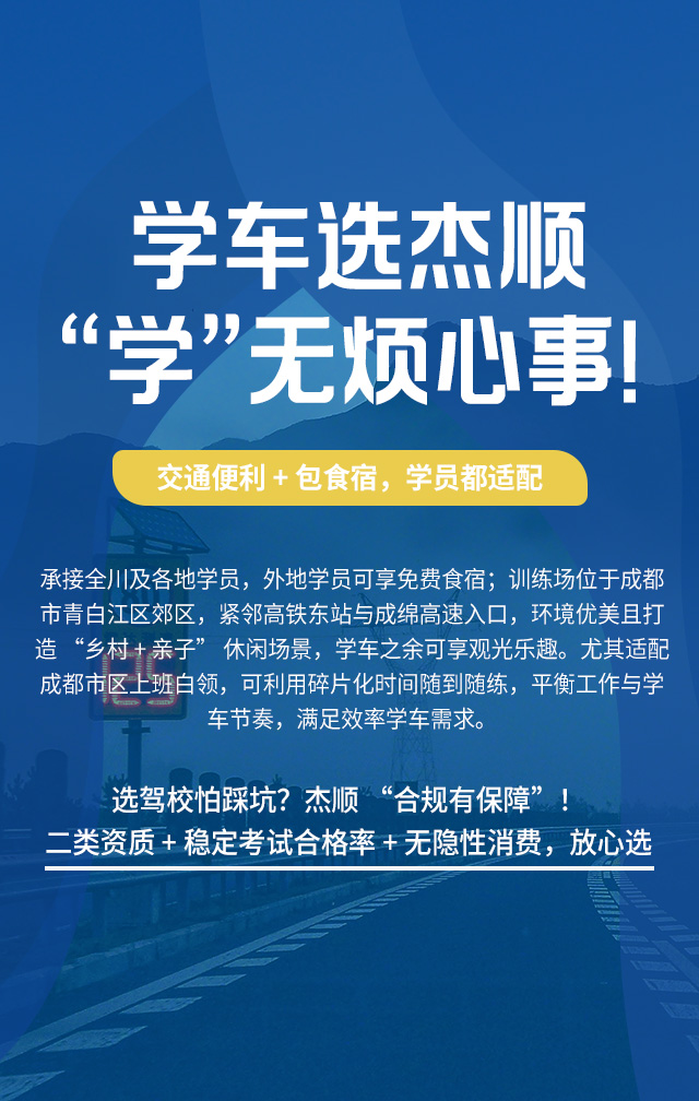成都杰顺驾校是四川省道路运输协会驾培驾考分会会员单位,已正式入驻“交管 12123”“天府市民云”两大官方 APP,资质合规可查。驾校起源于四川省长城驾校青白江分校(三类资质),经过10余年驾培服务积淀,现已升级为自主运营的二类机动车驾驶员培训学校,服务能力与教学水准多元提升。依托 “线上 AI + 互联网 + 线下实体门店 + 实地训练场” 的双渠道模式驾校选址紧邻青白江高铁东站、成绵高速入口,交通便利;训练场环境优美,不仅打造“田园+观光”有趣的休闲场景,并可考场练车,助力学员提前熟悉考试流程和点位外,驾校还坚持“一次性收费”,报名即签合同规避隐性消费,同时为外地学员提供免费包食宿服务,为理论困难户提供专属辅导(含精减高频考点题库、AI 智能刷题 + 人工逐题解析),服务覆盖全川及国内各地学员,致力于打造 “效率、透明、周全”的驾培体验。