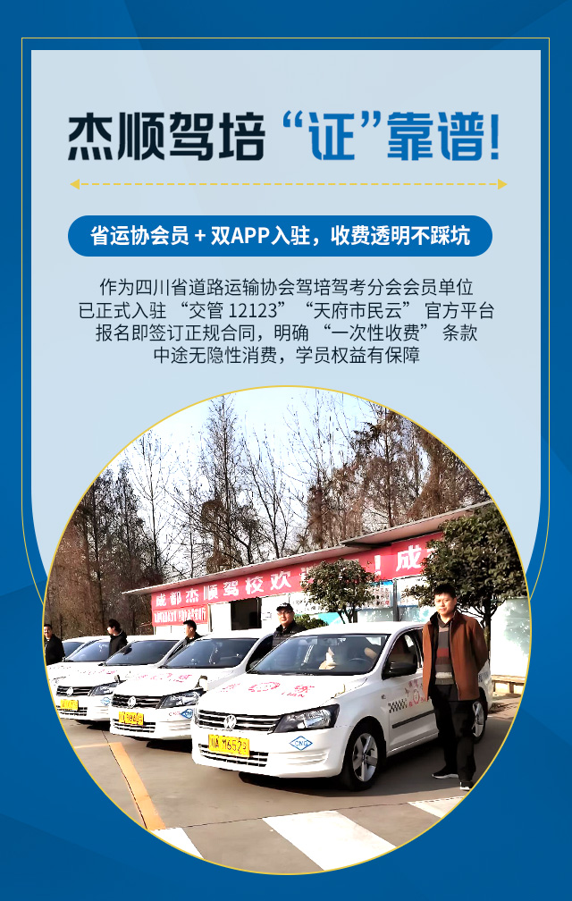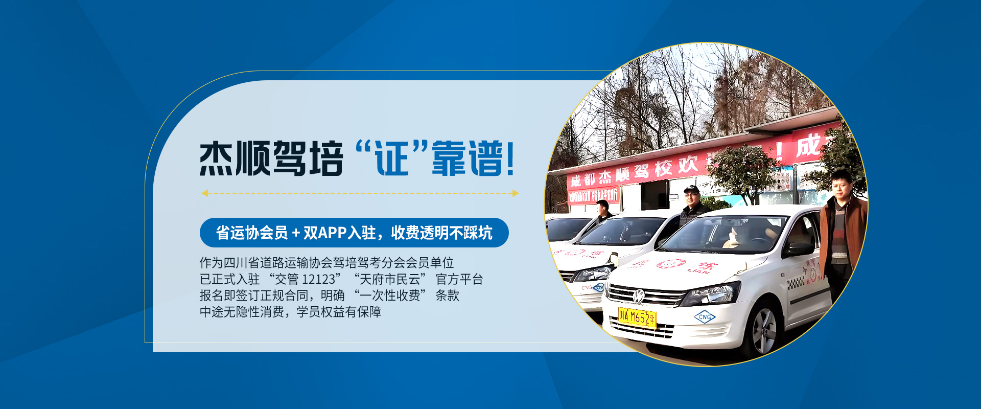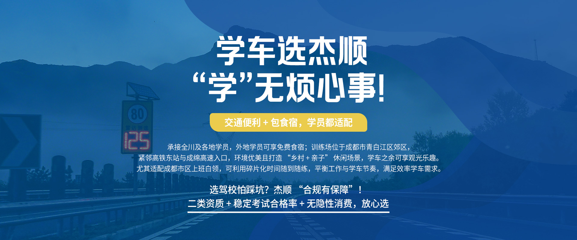 成都杰顺驾校是四川省道路运输协会驾培驾考分会会员单位,已正式入驻“交管 12123”“天府市民云”两大官方 APP,资质合规可查。驾校起源于四川省长城驾校青白江分校(三类资质),经过10余年驾培服务积淀,现已升级为自主运营的二类机动车驾驶员培训学校,服务能力与教学水准多元提升。依托 “线上 AI + 互联网 + 线下实体门店 + 实地训练场” 的双渠道模式驾校选址紧邻青白江高铁东站、成绵高速入口,交通便利;训练场环境优美,不仅打造“田园+观光”有趣的休闲场景,并可考场练车,助力学员提前熟悉考试流程和点位外,驾校还坚持“一次性收费”,报名即签合同规避隐性消费,同时为外地学员提供免费包食宿服务,为理论困难户提供专属辅导(含精减高频考点题库、AI 智能刷题 + 人工逐题解析),服务覆盖全川及国内各地学员,致力于打造 “效率、透明、周全”的驾培体验。